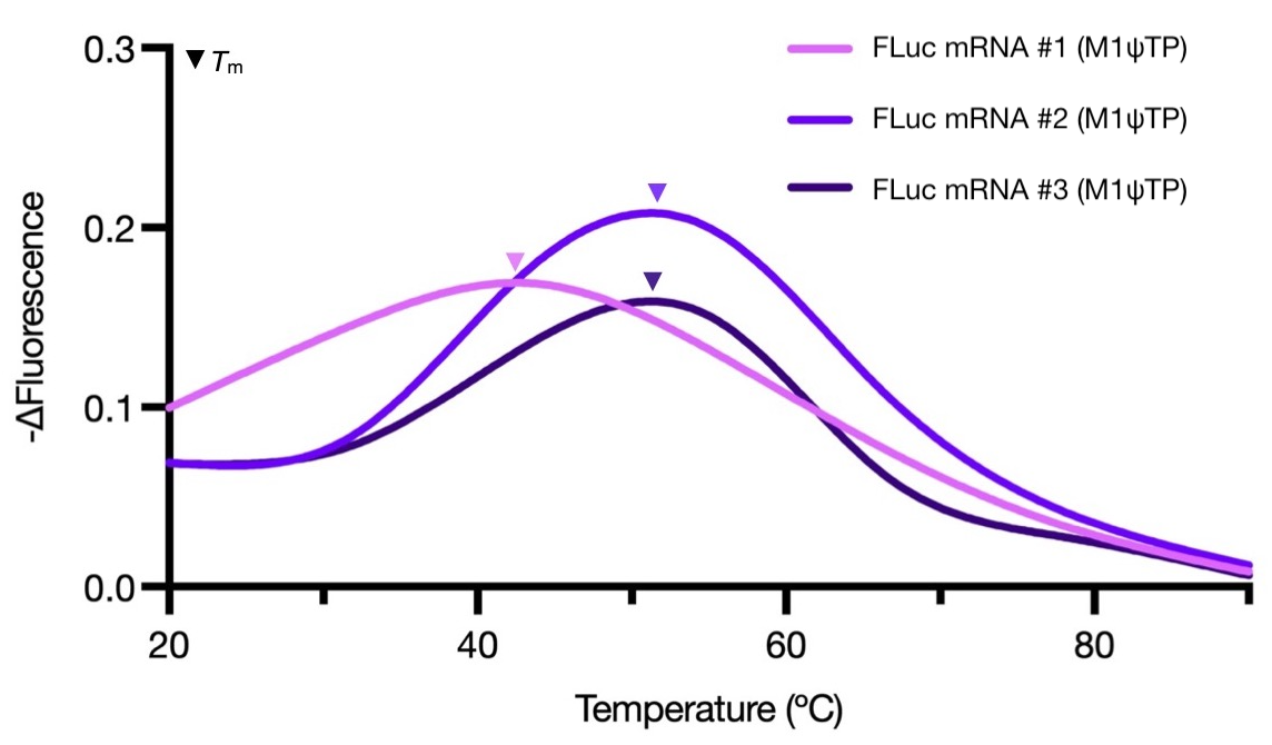 mRNA thermal stability curves for three different N1-methylpseudouridine-modified FLuc mRNA designs, as measured by differential scanning fluorimetry. mRNA melting temperature is denoted by the ▼ icon.
